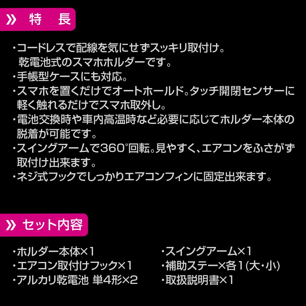 - 製品特徴 ・コードレスで配線を気にせずスッキリ取付け。乾電池式のスマホホルダーです。