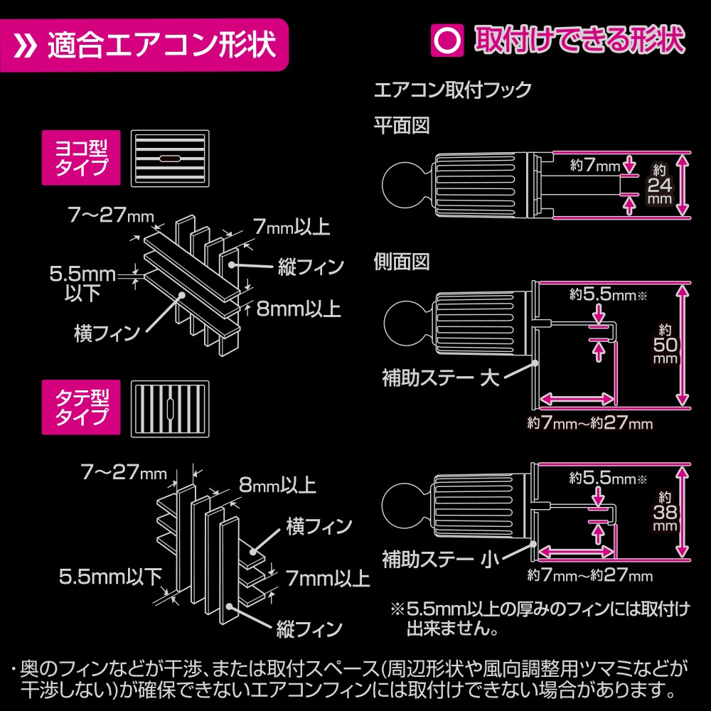 ・ネジ式フックでしっかりエアコンフィンに固定出来ます。 セット内容 ホルダー本体×1/エアコン取付けフック×1/アルカリ乾電池 単4形×2/スイングアーム×1/補助ステー×各1(大・小)/取扱説明書×1