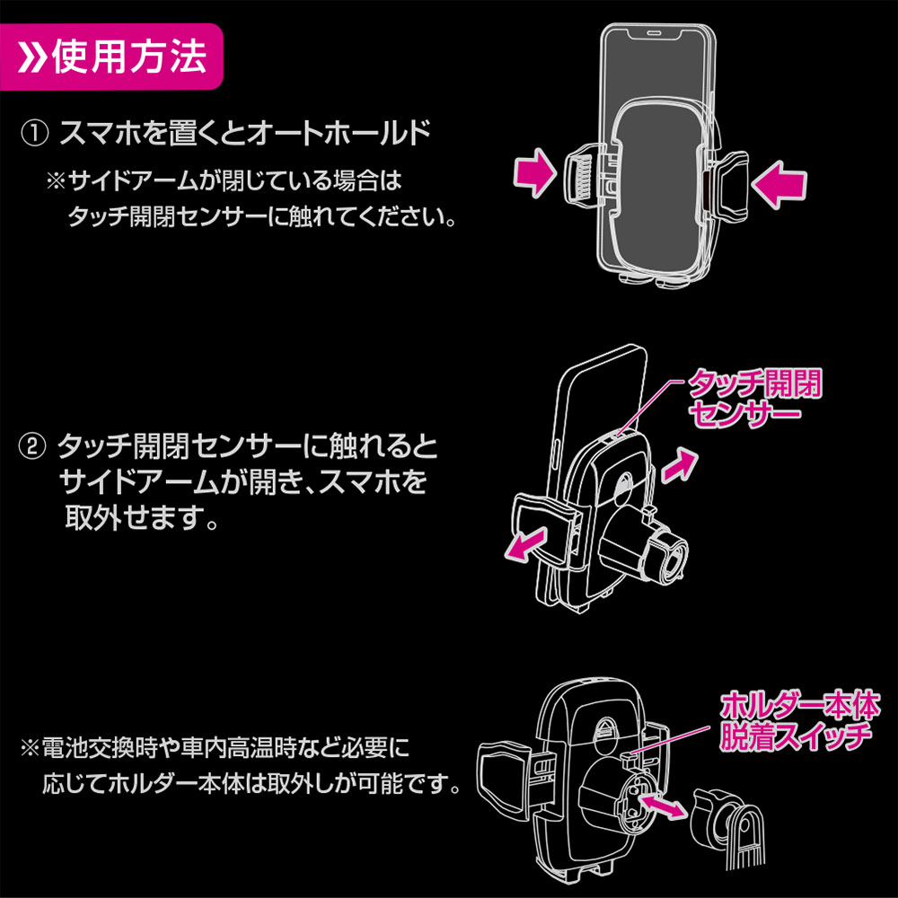 ・スマホを置くだけでオートホールド。タッチ開閉センサーに軽く触れるだけでスマホ取外し。