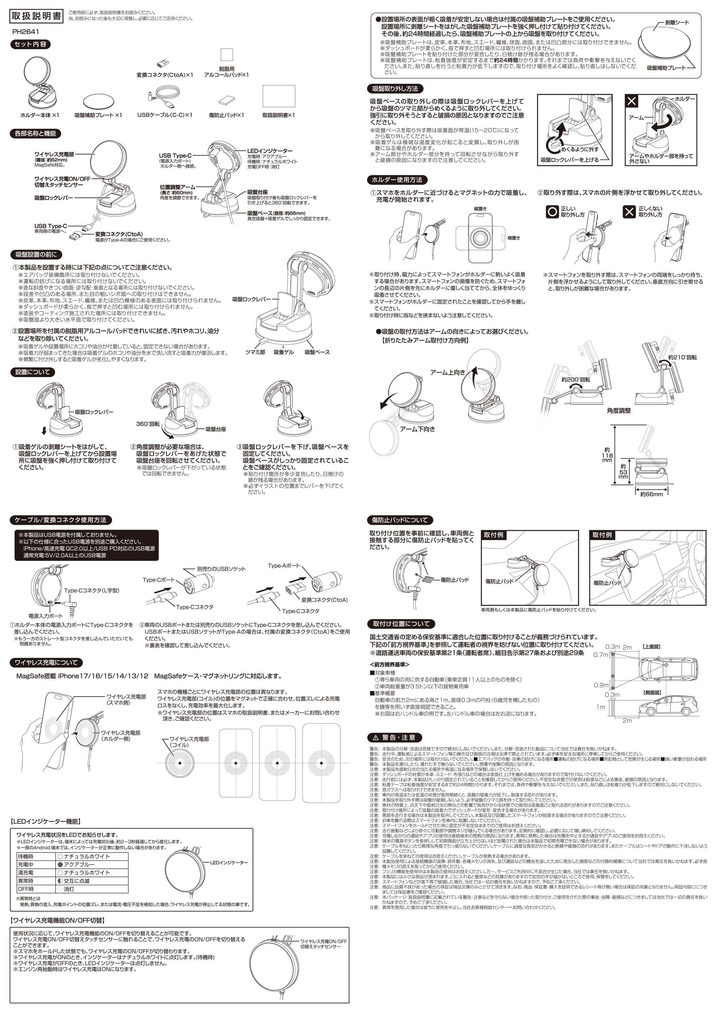 ホルダー本体×1 /吸盤補助プレート(3M粘着テープ)×1/USBケーブル(C-C)×1/変換コネクタ(CtoA)×1/傷防止パッド×1/脱脂用アルコールパッド×1/取扱説明書×1